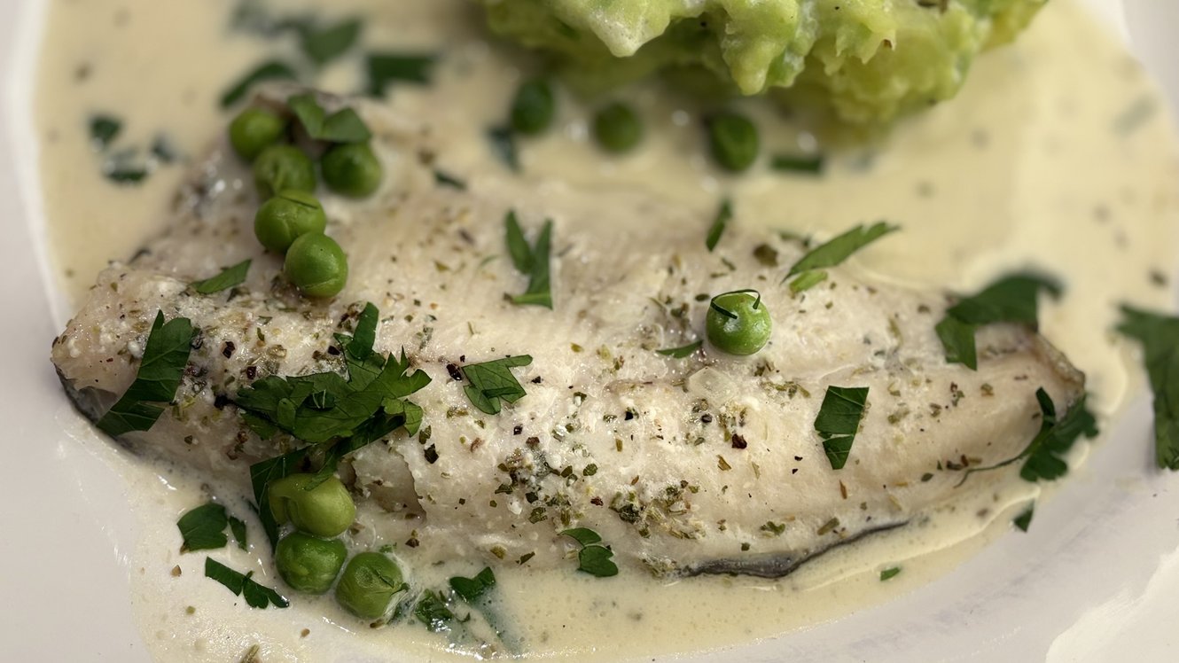 Kartoffelstock mit grünen Erbsen und Fischfilet mit Weissweinsösseli